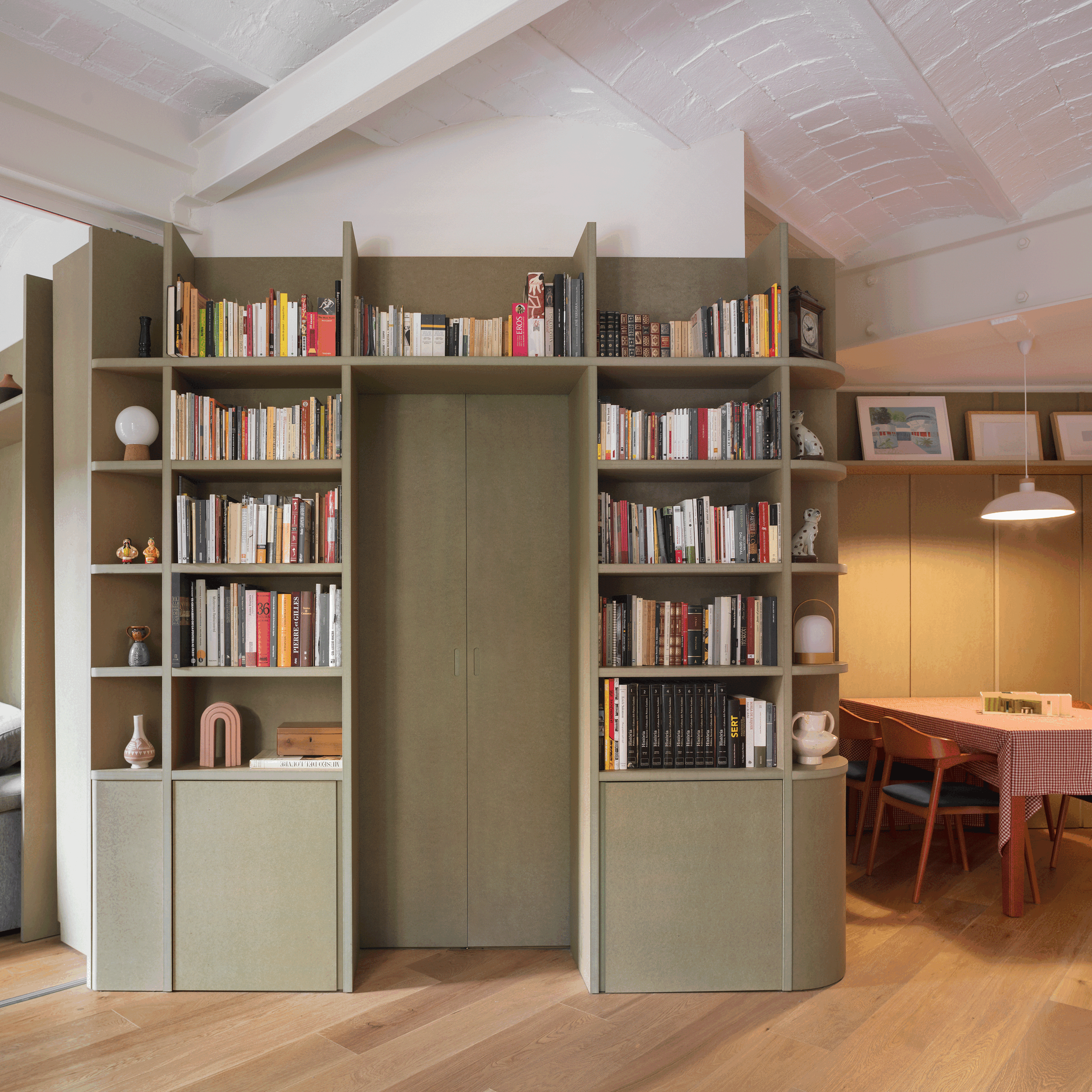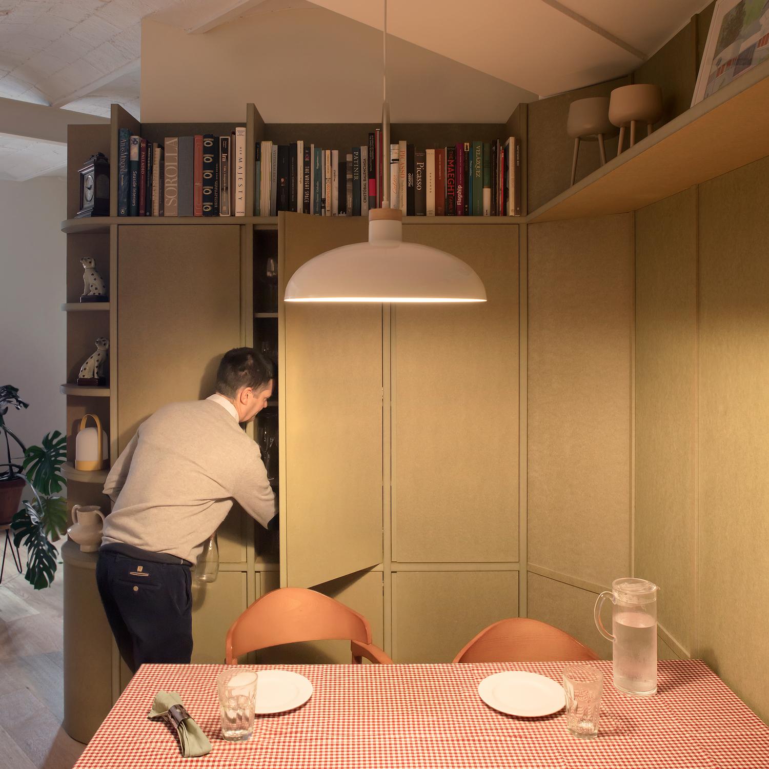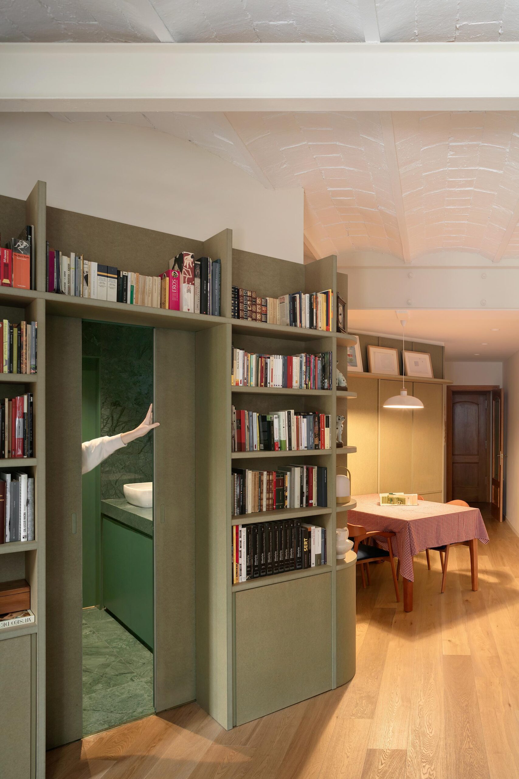 Amb la caixa central que acull el lavabo i funciona com distribuïdor, s’estalvia en zones de pas i pèrdua d’espai. S’aprofita el perímetre de la zona humida com un gran moble que distribueix el saló i menjador. La biblioteca exposa els seus llibres i objectes col·leccionats en viatges i mudances, serveix a la zona de menjador i recull els abrics alliberant el rebredor.