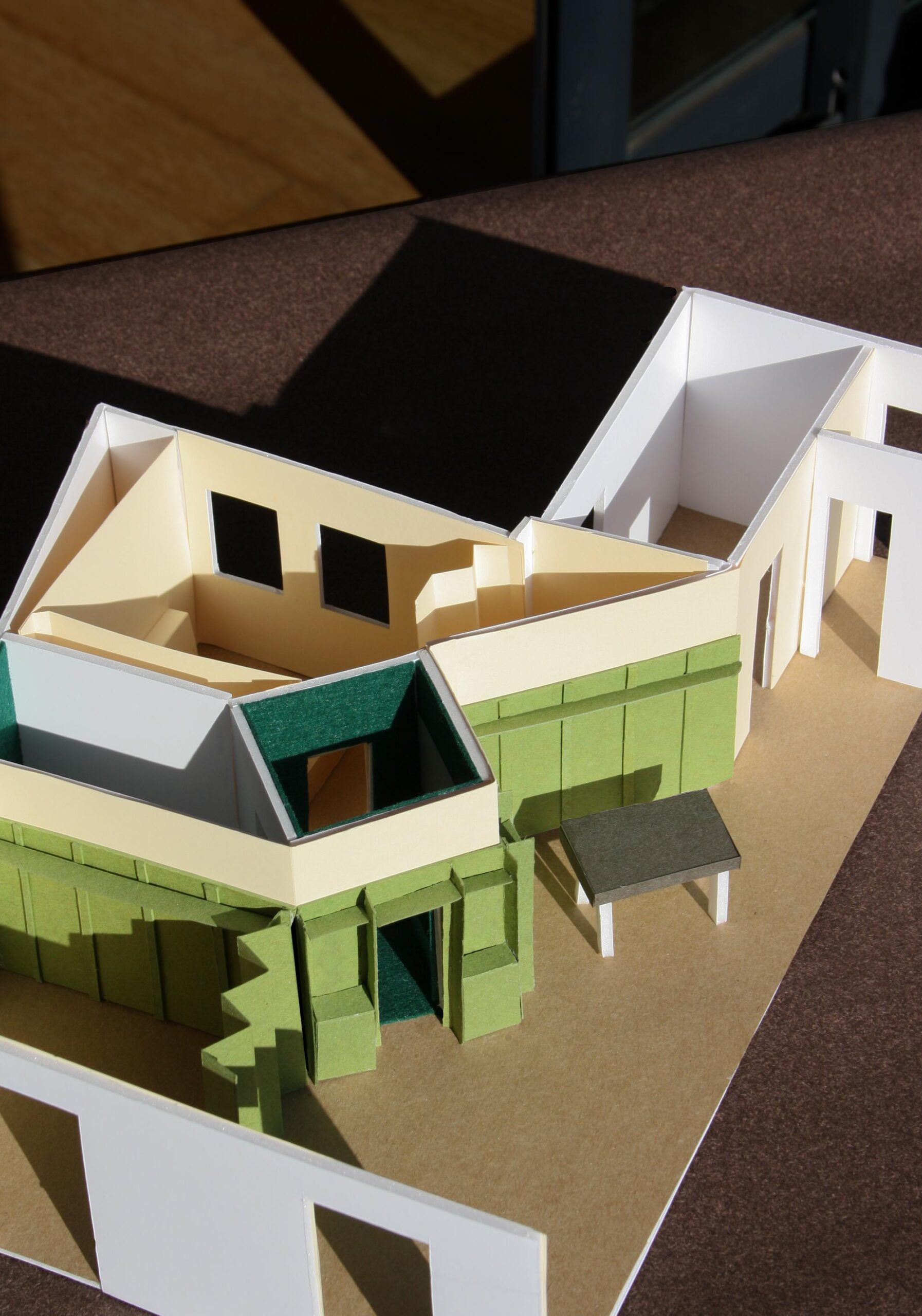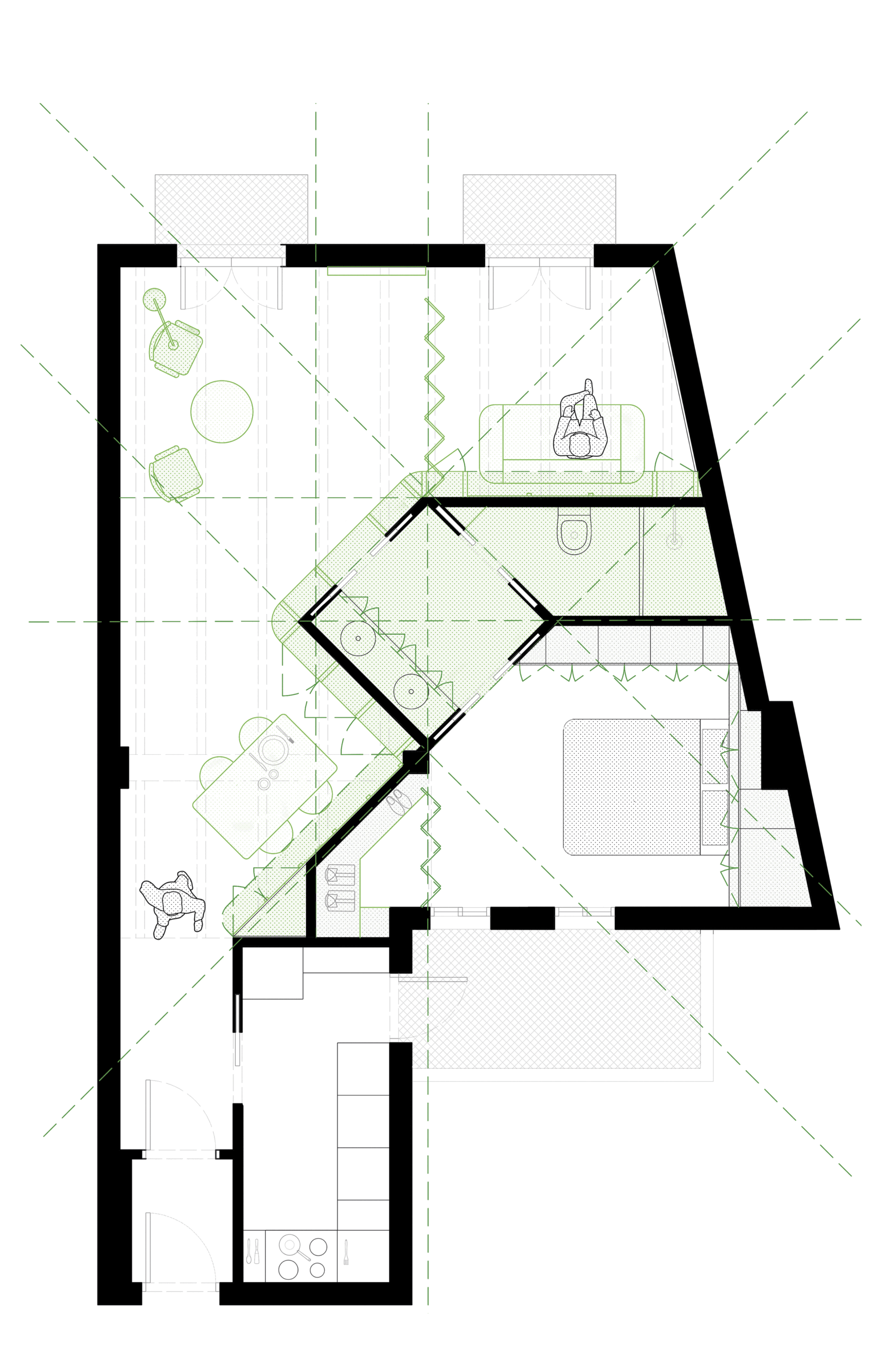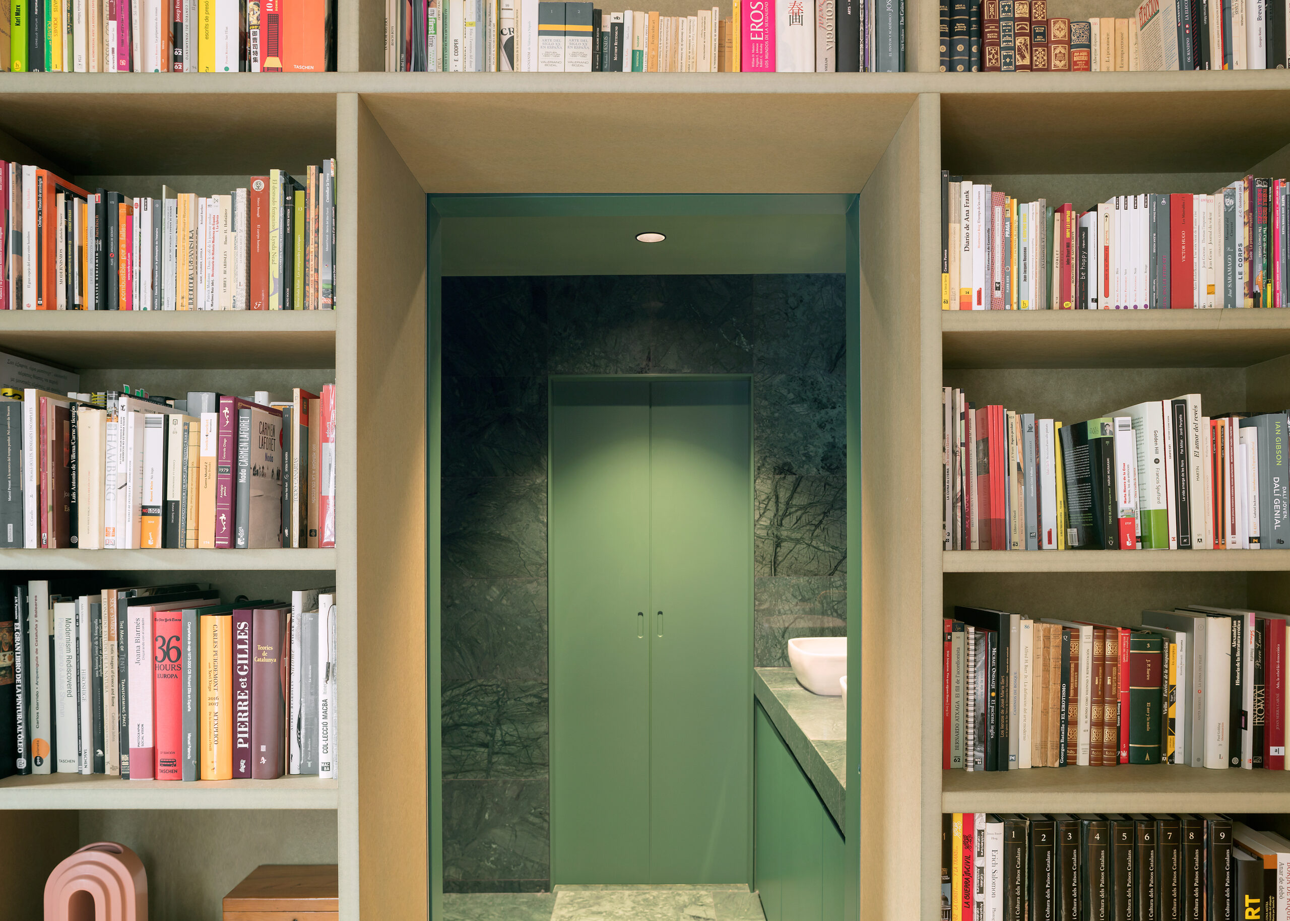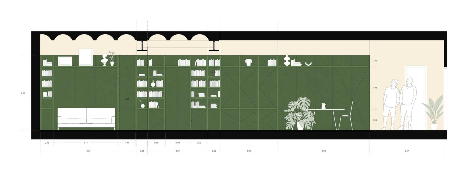 Amb la caixa central que acull el lavabo i funciona com distribuïdor, s’estalvia en zones de pas i pèrdua d’espai. S’aprofita el perímetre de la zona humida com un gran moble que distribueix el saló i menjador. La biblioteca exposa els seus llibres i objectes col·leccionats en viatges i mudances, serveix a la zona de menjador i recull els abrics alliberant el rebredor.