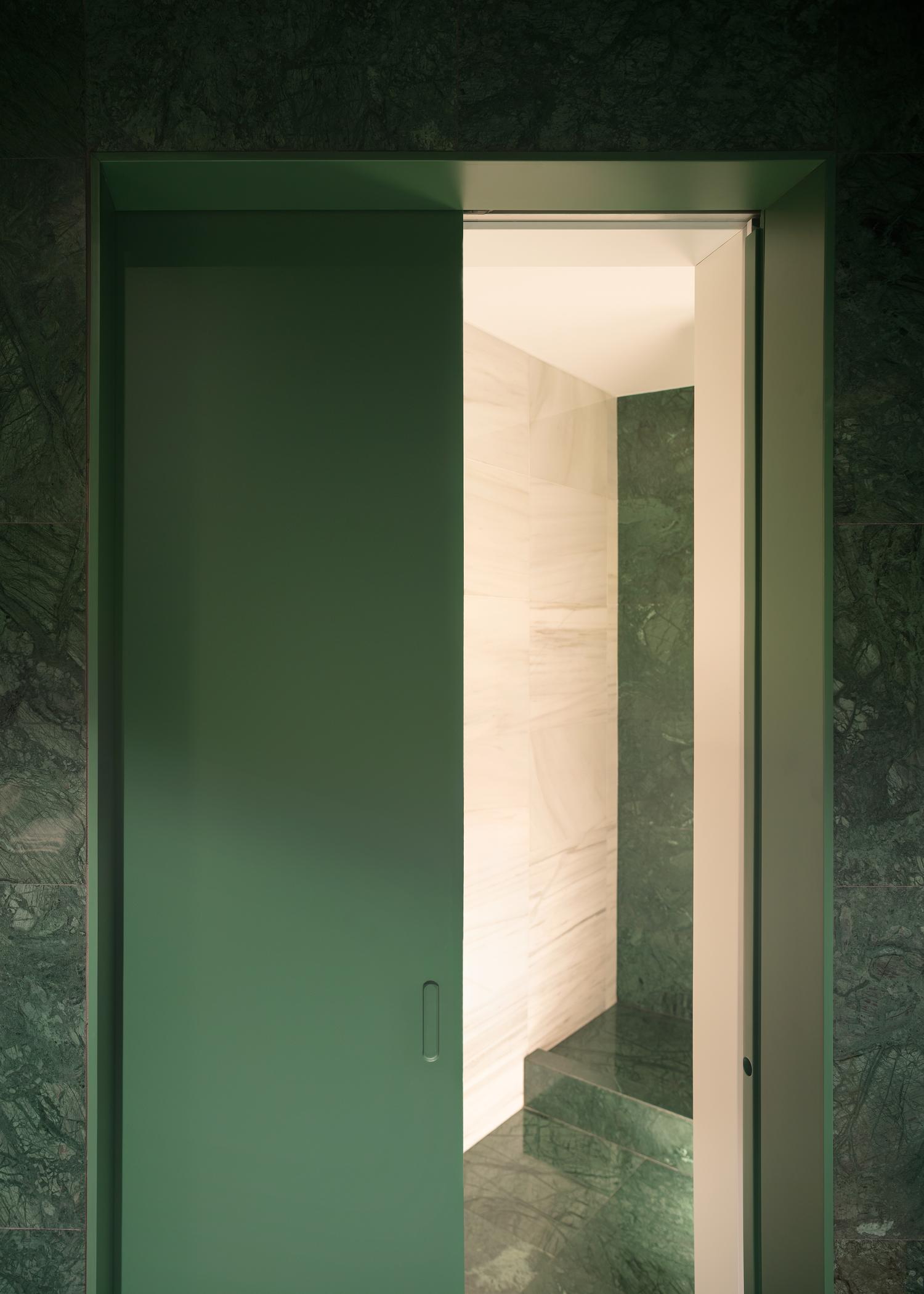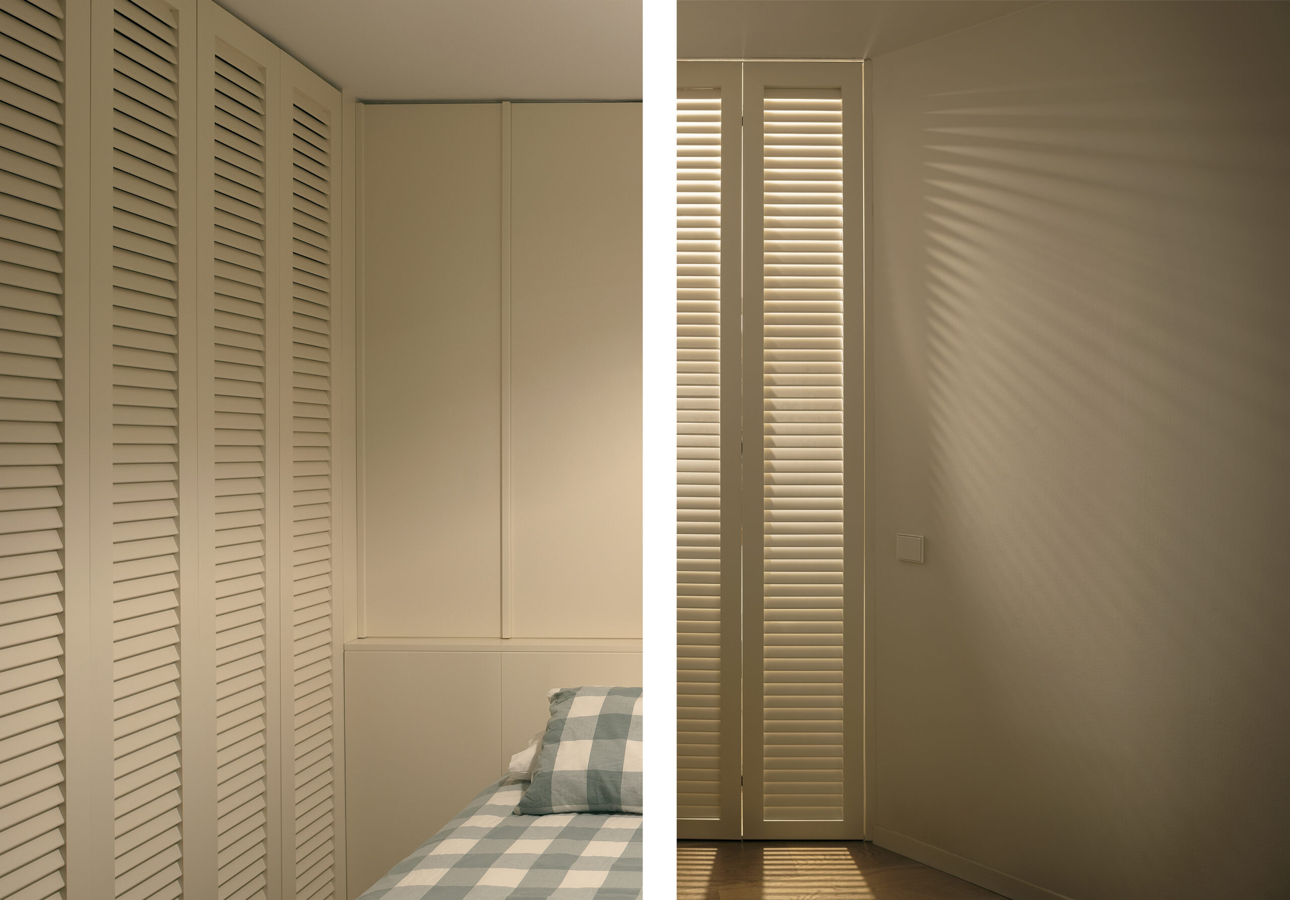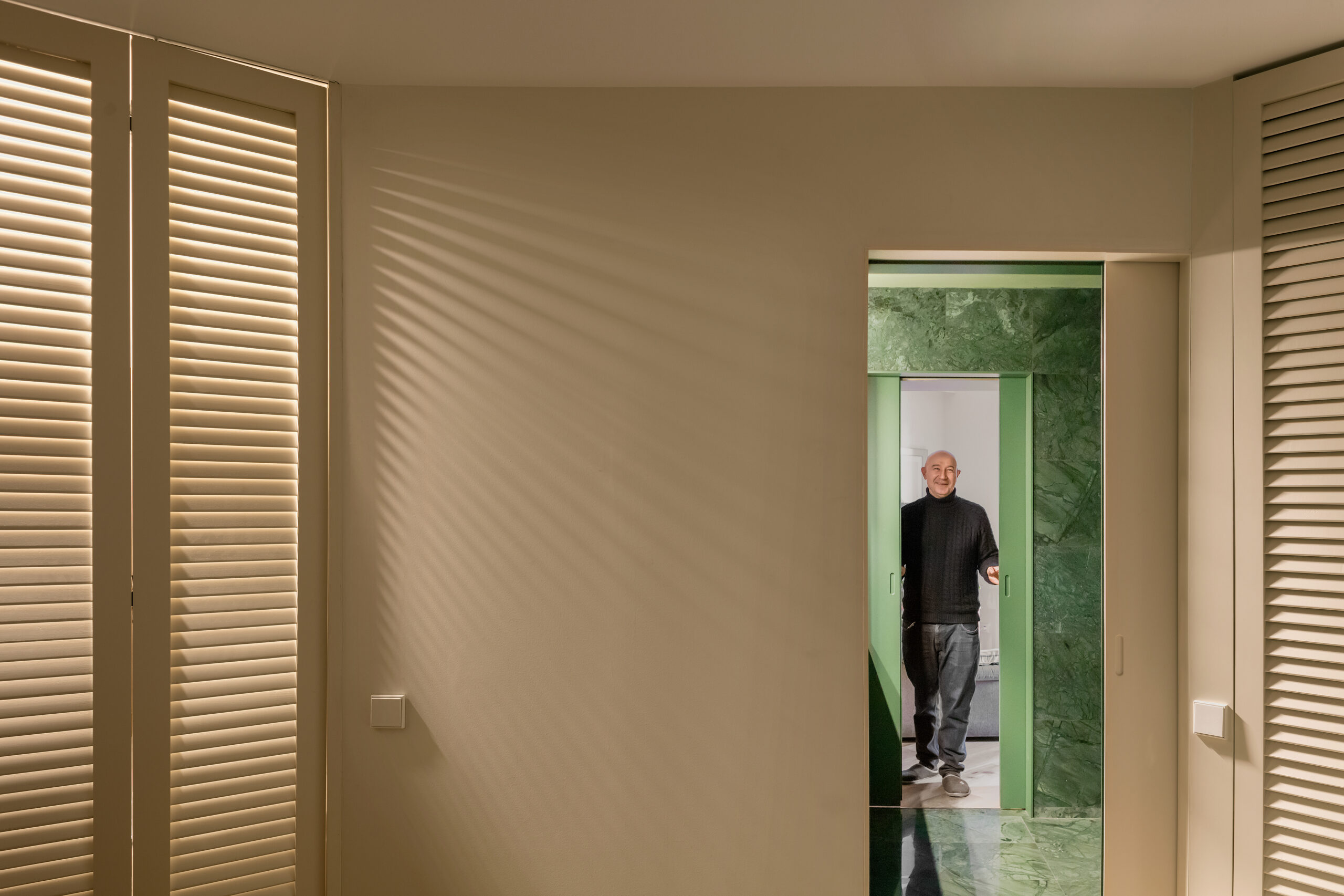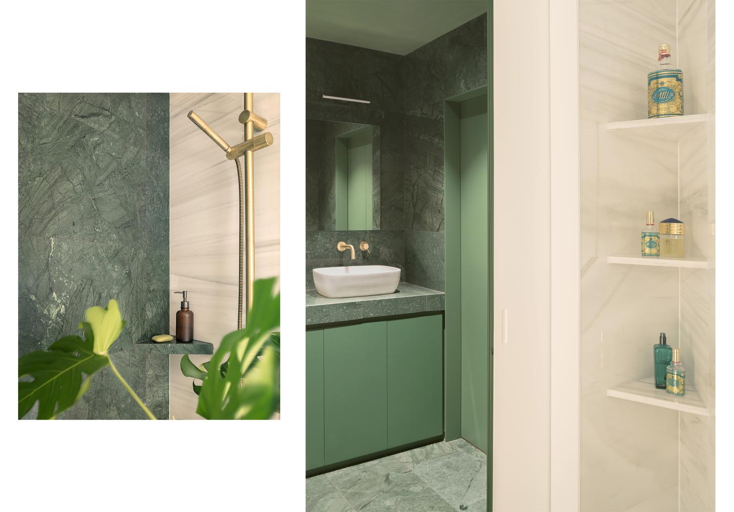 Amb MDF hidròfuga envernissada es construeix el moble serpentejant, la zona humida dona protagonisme al marbre verd i macael i al dormitori amb mobiliari a mida es treu partit a cada racó per emmagatzemar, suggerint els interiorismes de platja dels anys 80 i les persianes de les façanes barcelonines.